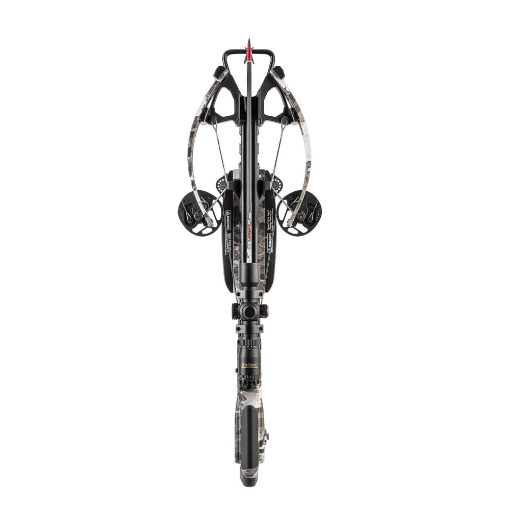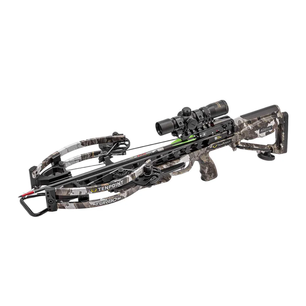 The Tenpoint Turbo S1 Crossbow Package (Vektra Camo) The most affordable and ultra-compact high-end crossbow on the market, featuring some of the latest innovations including the revolutionary ACUslide cocking and de-cocking system. Delivers speeds up to 390 feet per second and the shortest forward draw crossbow on the market at just 31-inches long and 7.2-inches wide. Features groundbreaking Auto-Break Gear System, allowing for silent cocking and safe, controlled de-cocking. The new brake pad design offers more robust braking power, eliminating the potential of losing control. The silent cocking and safe de-cocking system is highly recommended by dealers and requires just 5 pounds of force. The ACUslide is the easiest system on the market and requires a fraction of the force you need to cock or de-cock competitors’ bows. While using the ACUslide, you can remove your hand from the handle at any point, with no other action required – and the handle will stop in place. Features a new Dyneema cocking strap that has been upgraded to handle over 2,000 pounds of force. The 7.5-inch XTEND Adjustable Crank Handle reduces cocking effort to 5 pounds and stores securely in the butt-stock. Fueled by RX6-Cams which rotate 340-degrees. Revolutionary Vector-Quad cable technology utilizes four cables instead of the traditional two, eliminating cam lean and generating straight nock travel and same-hold downrange accuracy. Features the S1 2-stage, zero creep trigger with advanced roller-sear system for a crisp 3.5-pound pull. Trigger is equipped with a DFI (Dry-Fire-Inhibitor) and fitted with a nylon-filament arrow retention brush that improves arrow grip and alignment while reducing noise and vibration. An integrated string stop system is also included to further decrease noise and vibration. The new 19.5-inch MICRO-TRAC fluted aluminum barrel reduces the flight deck surface by half; with minimal string-to-barrel contact, you will have increased accuracy and longer string life. The barrel is fastened to the ultra-light two-piece TEC-TAC stock that features multiple weight-reducing cutouts and hollow pockets for storing accessories. Offered in the exclusive Vektra Camo pattern.